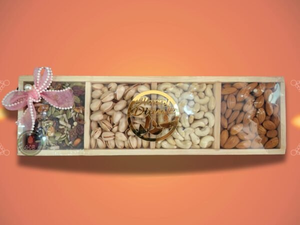 This elegant festive hamper is packed with the richness of handpicked dry fruits, beautifully arranged in a wooden tray with a transparent lid and bow decoration. Perfect for gifting on Diwali, weddings, or any special occasion.